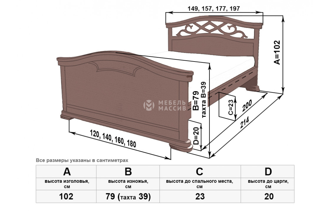 Благородная кровать Вирджиня сделана из качественного древесного массива. Изделие имеет изогнутое сплошное изножье и высокое изголовье с узором. Обе спинки плавно переходят в устойчивые ножки, которые защищают пол от повреждений. Купить эту прочную модель по выгодной цене можно в нашем интернет-магазине. Осуществляется доставка на дом по Орехово-Зуево и Московской области .| Размер | Цена | |