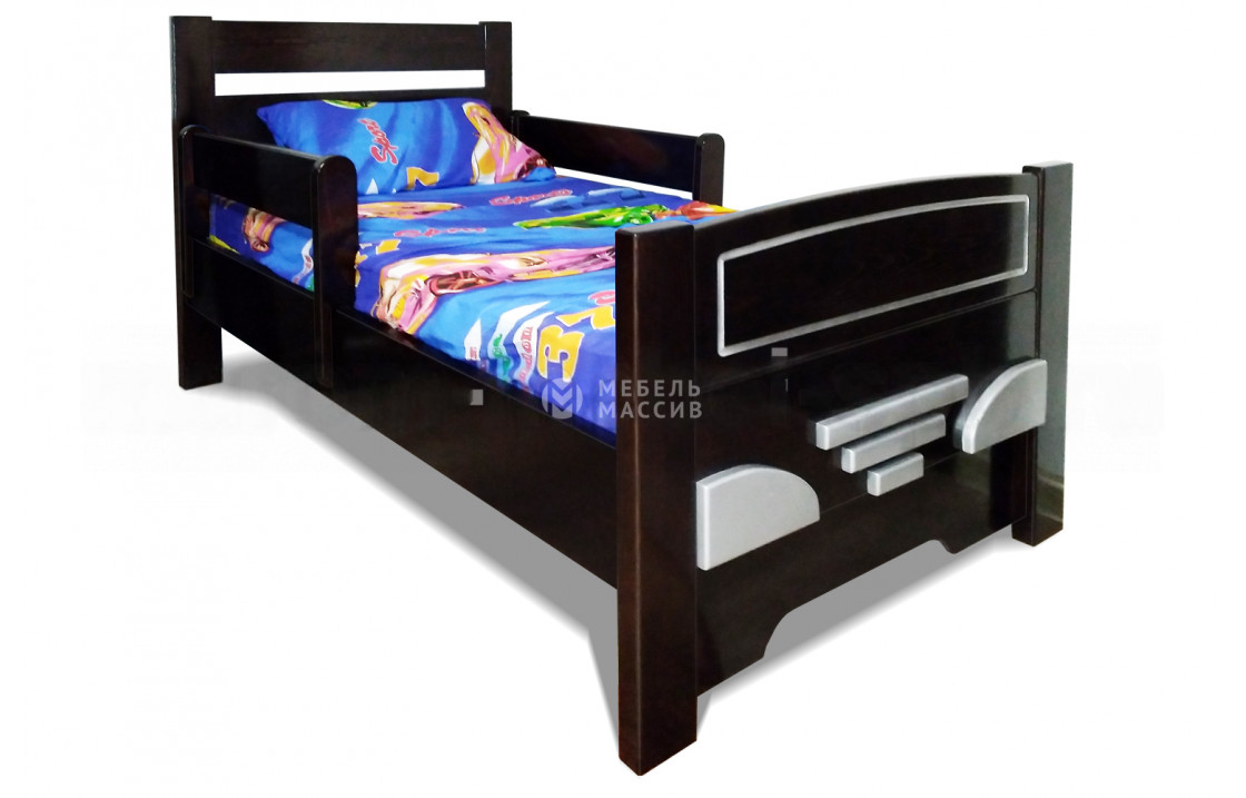 Автошка — необычная детская кровать, которая подойдет для меблировки комнаты мальчика. Материалом для ее изготовления послужил экологически чистый массив сосны. По внешнему виду кровать походит на автомашину, особенно здорово продумано дизайнерами изножье - прорези в виде капота автомобиля. Спальное место находится на средней высоте, так как ножки приподнимают кровать над уровнем пола. Для защиты от случайных падений во время сна или игры предусмотрены борта у изголовья. Подобный дизайн положительно влияет на создание уютной атмосферы, что важно для ребёнка. При заказе маленький покупатель получит возможность смены цвета дерева.| Размер | Цена | |