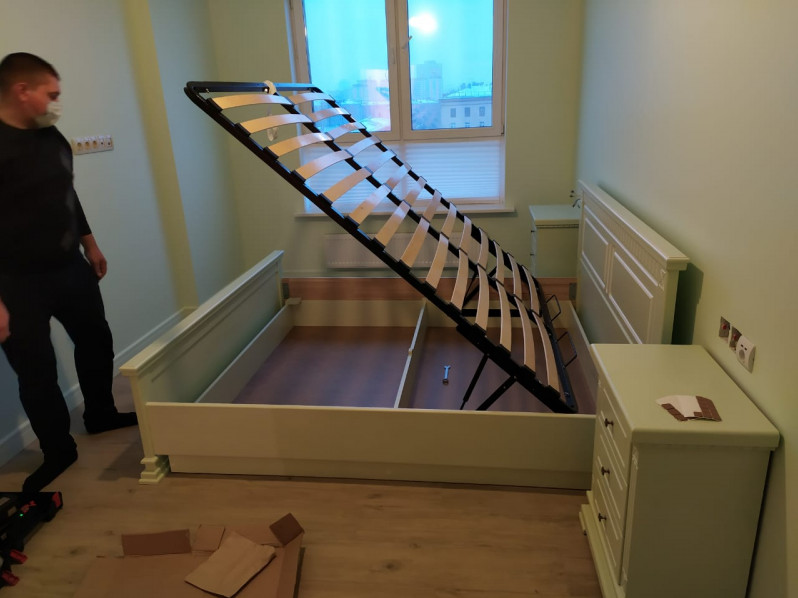 Спальный гарнитур из натурального дерева Флоренция с подъёмным механизмом , массив берёзы , цвет белая эмаль , декорирован серебряной патиной. Изделие укомплектовано матрасом с ортопедическим эффектом.