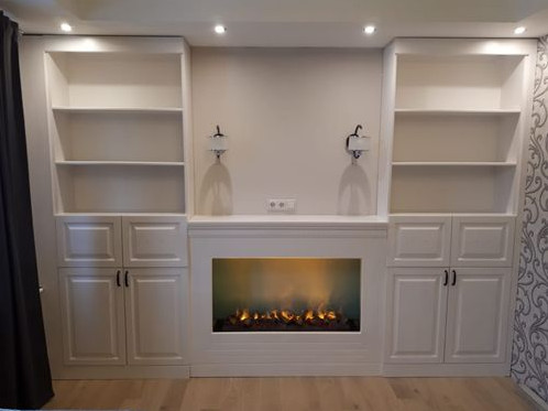 Встроенная стенка с декоративным камином из натурального дерева , массив сосны , цвет белая эмаль , мебель изготовлена по индивидуальному проекту.