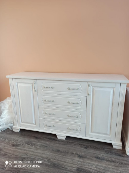 Спальный гарнитур из натурального дерева Лира, массив сосны, цвет белая эмаль, мебель выполнена по индивидуальному проекту. Изделие укомплектовано матрасом с ортопедическим эффектом.