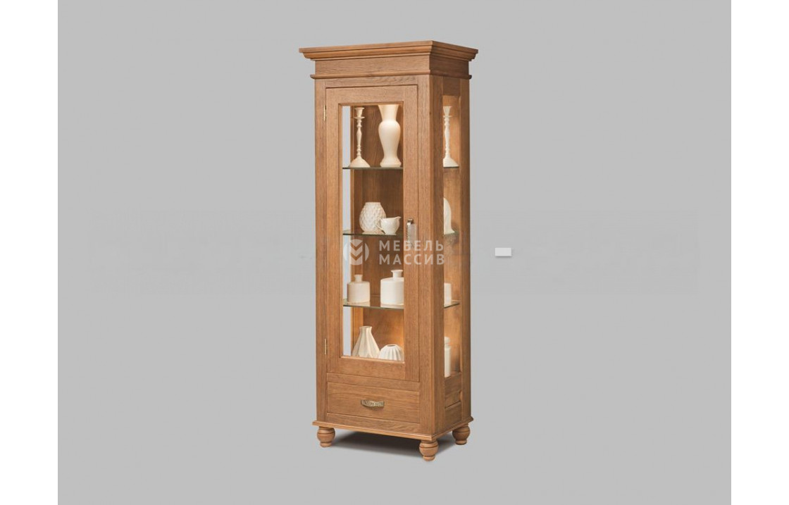 Винтаж 3 – сервант с одной створкой, изготовленный из натурального массива. Он занимает немного места и имеет отличные эксплуатационные характеристики. Внутреннее пространство модели поделено между четырьмя полками за застекленной дверцей, по бокам также есть стеклянные вставки. Полочки превосходно подойдут для размещения сувениров, коллекций, посуды и прочих предметов, которые хочется выставить напоказ. Дополнительно сервант оборудован закрытым ящиком на направляющих. Дизайн изделия больше относится к классической стилистике, но и в современных интерьерах мебель будет смотреться неплохо. Доставка по Орехово-Зуево и Московской области .| Размер | Цена | |