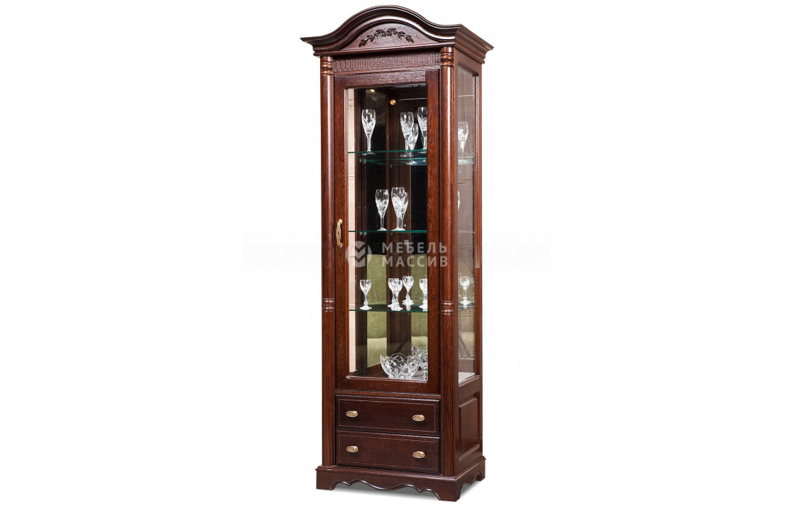Сервант Валео прекрасно дополнит интерьер кухни или столовой, созданных в едином с ним стиле. Мебель изготовлена из цельного массива сосны, что гарантирует надлежащее качество и долговечность при эксплуатации. Модель обладает хорошим функционалом. Состоит как бы из двух частей: верхний модуль позволяет увидеть элитную посуду или элементы декора на стеклянных полках за прозрачной дверкой, а нижняя часть образована двумя выдвижными ящиками на направляющих для скрытного хранения вещей и различных аксессуаров. Дизайнерами украшен и внешний вид мебели. Применены такие художественные приемы как резьба по дереву, декорирование цветочными элементами и красивая фурнитура. Цвет мебели выбирается индивидуально. Доставка по Орехово-Зуево и Московской области .| Размер | Цена | |