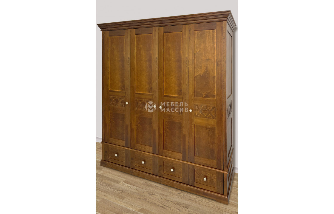 Шкаф Дубрава с четырьмя створками – вместительная модель с традиционным дизайном. Он отличается высоким качеством материалов и сборки. Внутреннее наполнение здесь представлено отсеком с перекладиной для вешалок с верхней одеждой, несколькими полками и выдвижными шкафами. Задняя стенка усилена вставкой, что повышает общую надежность. Широкий ассортимент цветов и множество вариантов фурнитуры позволят выбрать шкаф под определенный интерьер, также оттенки подчеркнут природную красоту древесной текстуры. Доставка по Орехово-Зуево и Московской области .| Размер | Цена | |
