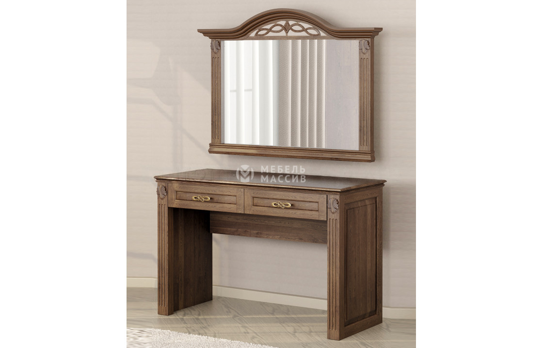 Туалетный столик с зеркалом Камила - прекрасное дополнение для меблировки спальной. Гарнитур выполнен в классическом стиле, поэтому он способен сделать комнату более уютной, обустроенной. В основе находится высокопрочный массив дерева, который практичен в использовании. Туалетный столик оснащён двумя выдвижными ящиками с современными направляющими, что значительно облегчает их открытие. Украшением внешнего вида конструкции служит инкрустация боковых элементов объемными фигурами. Зеркало размещается отдельно на нужную высоту и не только визуально увеличивает пространство помещения, но и улучшает качество освещения. При оформлении заказа можно выбрать нужный оттенок дерева и подходящую фурнитуру.| Размер | Цена | |